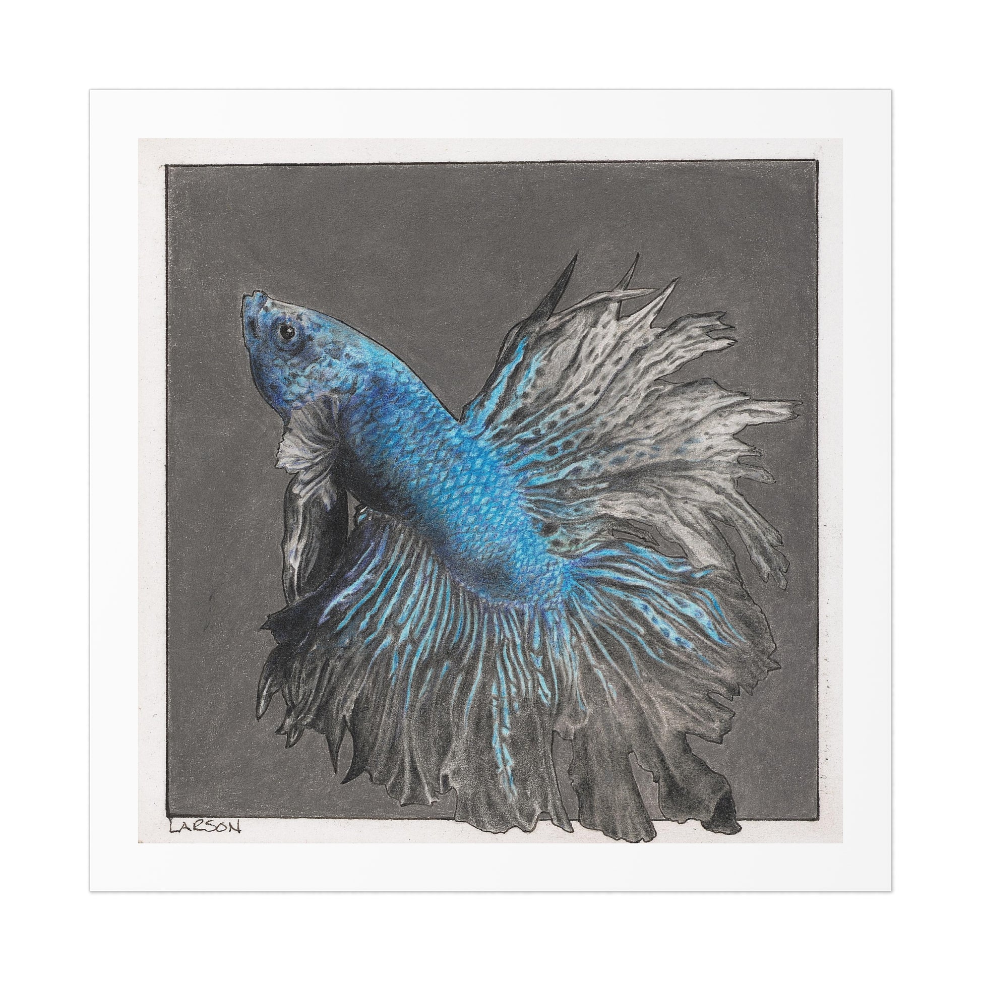 This is a reproduction of a small (4" x 4") colored pencil drawing I had done of a blue and black frilled, male Betta fish. Since the original piece was a small one, this print will also be a small one. The paper size for this print will be 8" x 8" and the actual image size is 7" by 7".